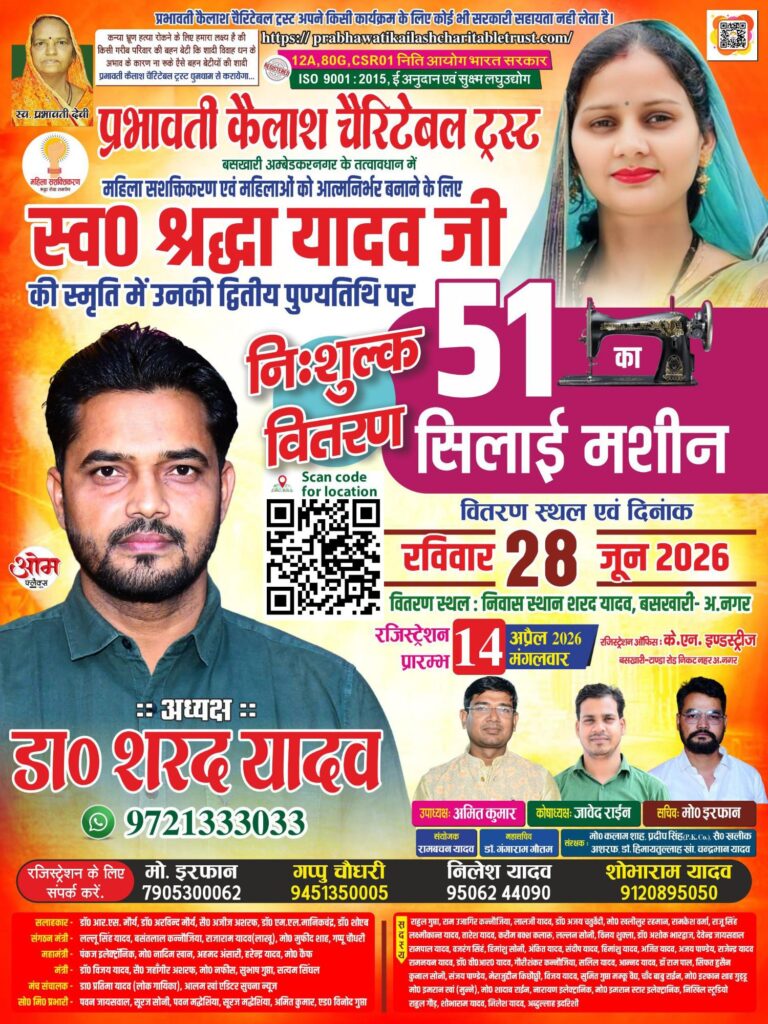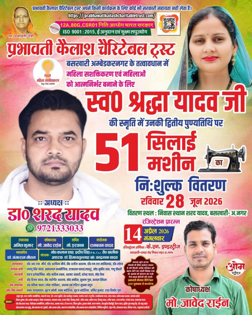 महिला सशक्तिकरण को जमीनी स्तर पर मजबूत करने की दिशा में एक सराहनीय पहल करते हुए प्रभावती कैलाश चैरिटेबल ट्रस्ट, बसखारी द्वारा इस वर्ष भी 51 जरूरतमंद महिलाओं को निःशुल्क सिलाई मशीनें वितरित की जाएंगी। यह आयोजन स्वर्गीय श्रद्धा यादव की द्वितीय पुण्यतिथि के अवसर पर रविवार, 28 जून को आयोजित किया जाएगा।